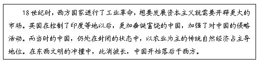 教师补充:除此之外,受儒家旧思想影响,清朝统治者认为“农为天下之本务,而工贾皆其末也”。统治者坚持以农业为本,为限制民间工商业的发展,对内推行“重农抑商”的政策,同时也实行“闭关锁国”,限制对外贸易。